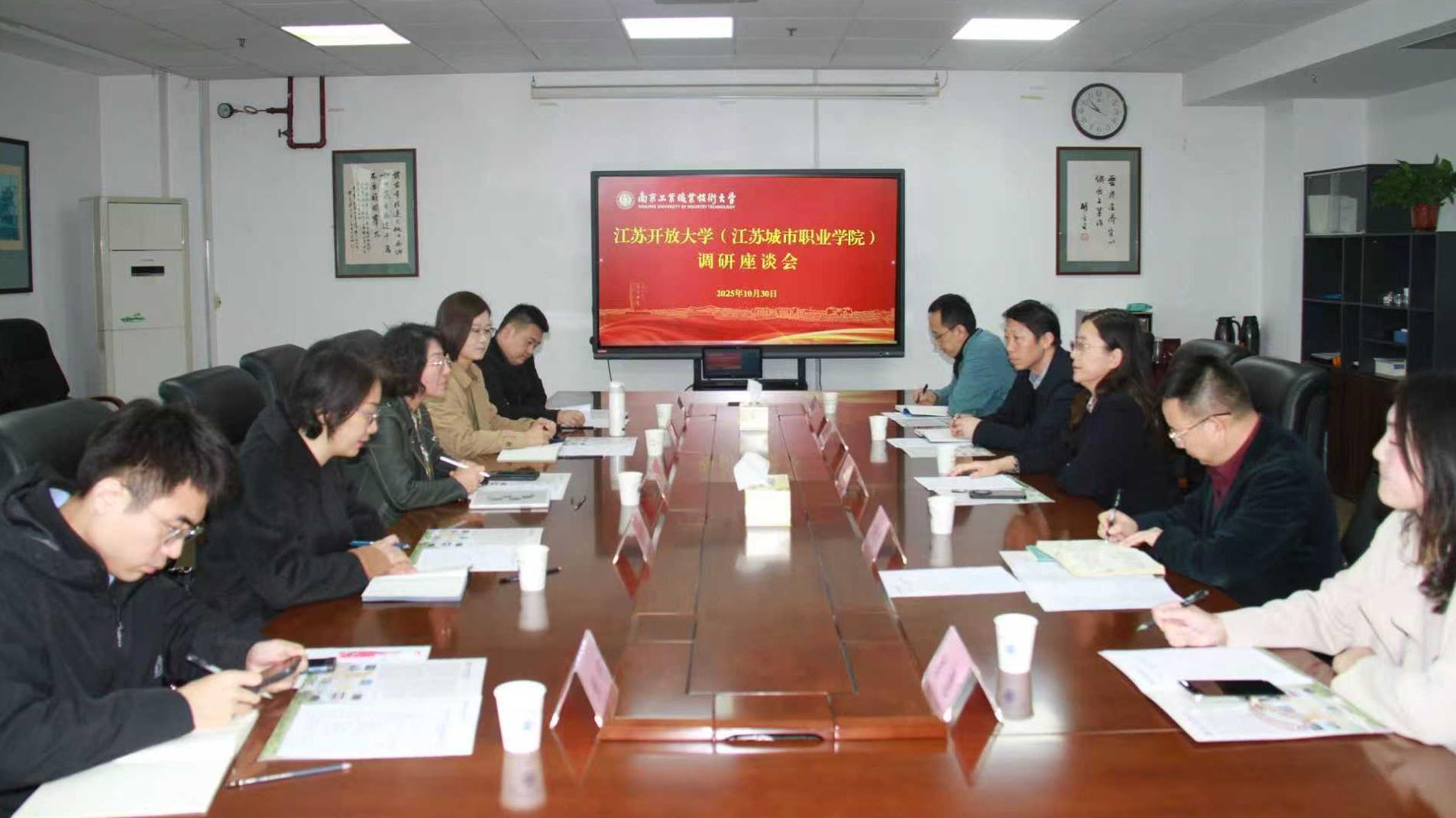 10月30日上午,江苏开放大学(江苏城市职业学院)副校长张晓一行来校调研。万象城官网党委常委、副校长魏萍在行政楼401会议室接待来宾,相关职能部门负责同志参加座谈。