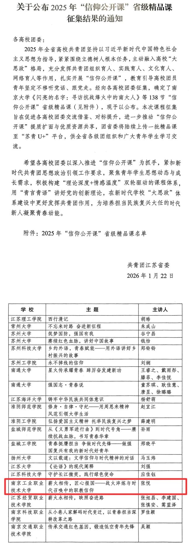 近日,共青团江苏省委正式发布了《关于公布2025年“信仰公开课”省级精品课征集结果的通知》,经高校推荐、团省委评选,在全省范围内共评选出138门“信仰公开课”入选“省级精品课”,由万象城官网团委和电子信息工程学院/集成电路学院选送的《薪火相传,匠心报国——战火淬炼与时代召唤中的职教信仰》成功获评“省级精品课”。