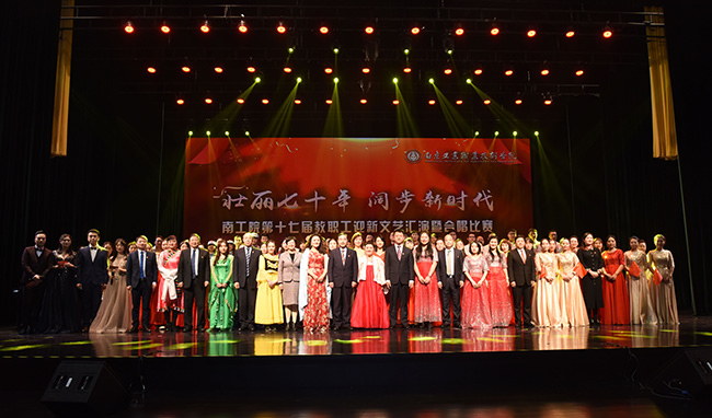 2019年是中华人民共和国成立70周年,也是学校新百年的开局之年。为庆祝新中国成立70周年,深入学习贯彻习近平新时代中国特色社会主义思想和党的十九大精神,激发全校教职工爱国爱党热情,12月31日,“壮丽七十年,阔步新时代”南工院第十七届教职工文艺汇演暨合唱比赛在大学生创新发展中心剧场举行。学校党委书记吴学敏,党委副书记、校长谢永华,党委副书记苏小冬,党委委员、纪委书记于林惠,党委委员、副校长霍雄飞、朱建国、崔新明,总督学卢兵,党委委员、组织部长高宏彦,党委委员、宣传部长刘畅出席并参与演出,全校800多名教职工参与了本次活动。
