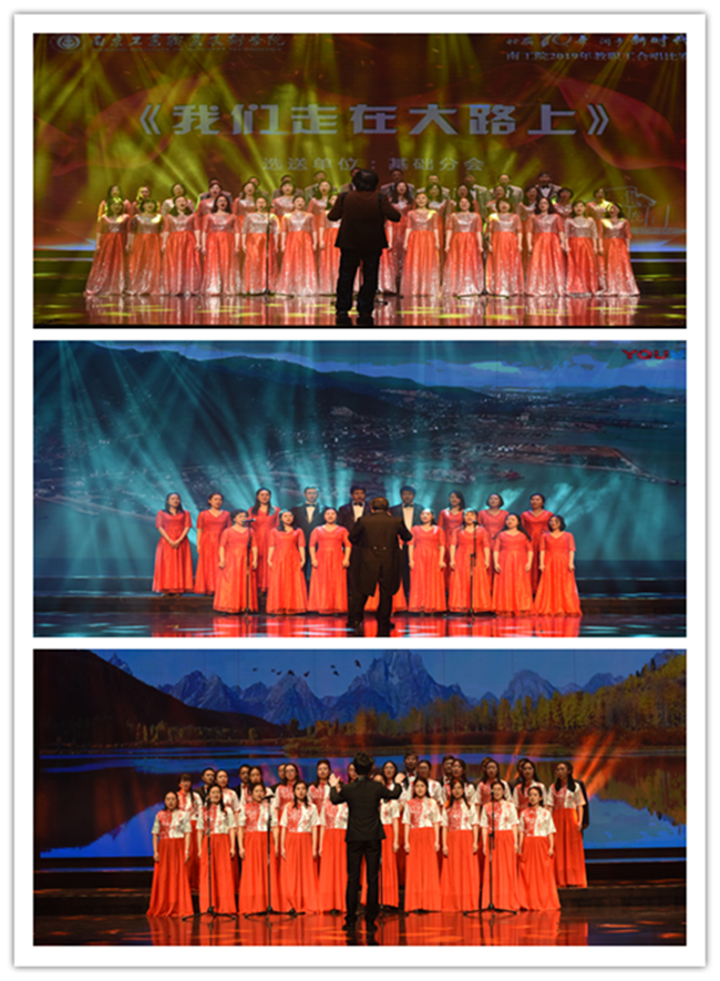本次合唱比赛以“壮丽七十年,阔步新时代”为主题,共设歌唱祖国、走向复兴和爱我中华三个乐章,各参赛队伍着装统一、精神抖擞,用饱满的激情和嘹亮的歌声唱出对伟大的祖国和伟大的中国共产党的无限热爱。经过激励的角逐,马院、社科分会演绎的《长江之歌》获得一等奖;体育分会、图书馆分会、继教分会演绎的《走向复兴》、机械分会演绎的《打起手鼓唱起歌》获得二等奖;机关一分会演绎的《唱支山歌给党听》、国教分会演绎的《爱我中华》、交通分会演绎的《天路》获得三等奖。
