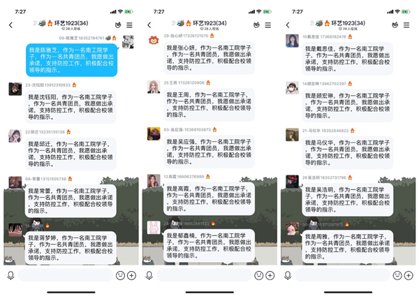 环艺1923班团支部在QQ群举行了本次团日活动。活动中,团支书陈雅芝同学首先带领支部团员围绕“面对疫情我们怎样保护自己?”、“新型冠状病毒有何特点?”等问题展开了讨论,团员们各抒己见,交流分享自己的防疫知识和经验。随后,支部团员集体宣誓承诺:坚决履行团员义务,配合学校防疫安排,打好这场防疫阻击战!