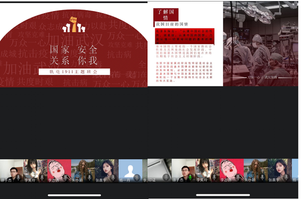 2020年新春,突如其来的新冠肺炎疫情给国家安全和人民生命健康造成严重威胁。轨电1911班全体成员针对于当下疫情,就“生物安全”问题在主题班会上展开热烈讨论。学习委员徐子杰讲述了自己的所悟所感,感慨现阶段中国疫情得以有效控制和中国共产党的有力领导和中国社会主义制度的优越性是密不可分的,徐同学的讲述激起了全体同学的共鸣,大家纷纷为自己作为中国人感到自豪而幸福。班会尾声,全班进行了疫情知识学习竞赛,让同学更深入了解疫情的科学知识,用科学的理论武装头脑,做到不信谣不传谣不造谣。