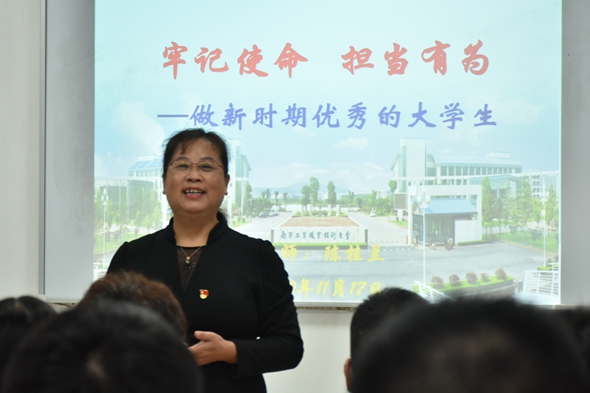 陈桂兰作了题为《牢记使命,担当有为——做新时期优秀的大学生》,她从党的十九届五中全会精神切入,传达了会议主要精神,从国家总体目标、学校发展目标,延伸至个人成长目标,鼓励同学们努力学习,勇担时代使命,做优秀大学生。她指出要成为一名新时代优秀大学生,首要是有过硬的专业知识和个人素质,同时具备高尚的道德情操,要学会合理安排大学生活,学会人际交往,懂得感恩,养成良好的性格和生活习惯。勉励学生干部心怀奉献精神,树立服务意识。最后,陈桂兰用“敢为人先,责先利后,敬业乐群,追求卓越”来鼓励大家,不断进取培养创新意识,争做新时代的优秀大学生。