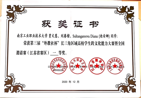 12月8日,第三届“外教社杯”长三角区域高校学生跨文化能力大赛比赛省赛评审工作在东南大学九龙湖校区举行,公共基础课部和国际教育学院选派了刘赓楷(2019级机械制造与自动化专业)、贾文慧(2020级国际贸易专业)和Sultangareeva Diana迪安娜(留(2019秋)国际贸易专业)等三名选手组成比赛团队,近日大赛结果公布并颁发证书,万象城官网学生团队喜获大赛一等奖。公共基础课部大学英语教研室张卉和国际教育学院孙世娟两位老师荣获“优秀指导教师”称号。
