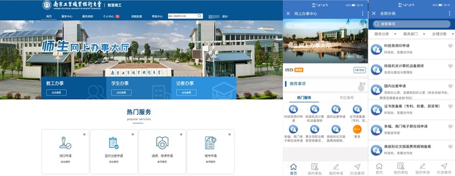 新版网上办事大厅按照“微服务架构、多端一体化”理念进行建设,同时提供PC端和手机端两种使用方式,可分别通过PC端浏览器、手机端“AI南工”企业微信平台进行访问。新版网上办事大厅对原版本功能进行了升级,设立了服务清单、服务中心、个人中心、效能监督等栏目。其中,“服务清单”汇集了校内各机关部门单位的工作职责、服务事项、岗位责任“三张清单”,师生可以根据该清单查清校园办事“属于哪个部门、怎么办理、找谁办理”;“服务中心”汇集了可以提供的线上服务事项,并按照服务对象、服务类别、所属部门进行分类查找,目前入驻的本批服务事项有25项,接下来会将简道云提供的43个服务流程迁移入驻,对教师、学生、科研等平台提供的流程集成入驻;“个人中心”按照我的待办、我发起的、我处理的、抄送我的进行分类,可以快速定位需要自己处理、已处理和需要自己知晓的事项;“效能监督”对各部门入驻网上办事大厅的服务事项数量和线上办事效率进行统计分析和公开展示。