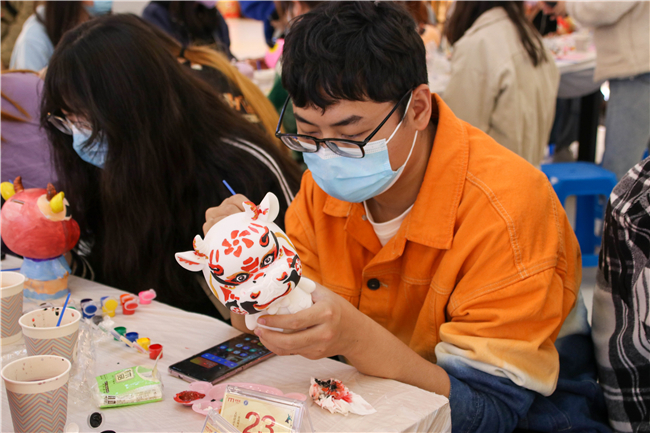 开幕式上举行了现场创意彩绘比赛。两个小时的比赛时间里,同学们充分发挥专业特长,将中国传统文化中的龙凤纹样、祥云图案、中国织绣、飞天人物等元素融入创作。周边市民被深深吸引,纷纷驻足观看。经现场评委打分,室内1921团支部李苗同学荣获一等奖、产艺2021陈叶等五名同学荣获二等奖、环艺1911慎业颖等十名同学荣获三等奖。