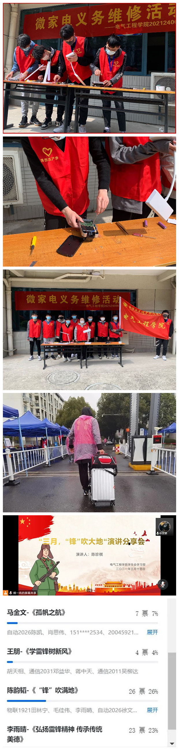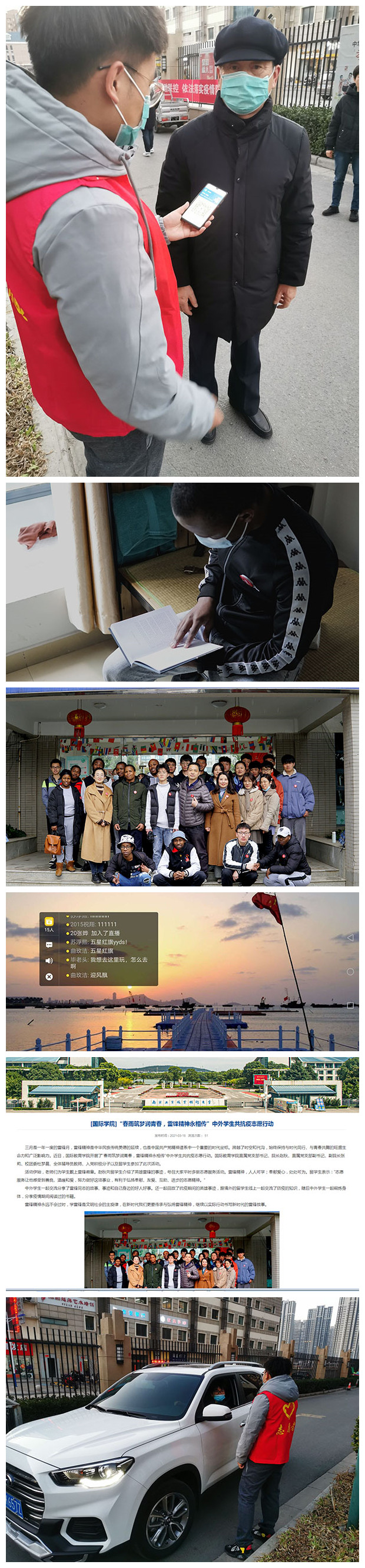 机械工程学院紧紧围绕社会主义核心价值观和雷锋精神内涵,先后举办寻找战疫中的雷锋——征集“最美逆行者”事迹宣传报道活动和致敬雷锋精神,重温历史记忆主题团日活动,通过活动的开展,同学们受益匪浅,体会到了雷锋的无私奉献精神,作为机械学子更深刻理解到了雷锋的价值信念和道德取向在新时代的意义。同学们纷纷表示在以后的生活和学习中能秉持这种精神,积极向上,努力学习,为社会主义事业和学校“十四五”建设添砖加瓦;电气工程学院组织志愿者们在校内各公寓站口开展了微家电义务维修活动和“身边的青年雷锋”——志愿故事分享会,活动不仅为学生们提供了锻炼自己的平台,也使大家用自己的“亲历亲为”服务了校园,以实际行动践行新时代雷锋精神,掀起了学雷锋活动热潮,展示了电气学子的劳动美,为和谐校园的建设作出贡献;航空工程学院组织志愿者“学党史,牢记初心使命 学雷锋,尽显青年担当”主题团日活动和“弘扬雷锋精神 凝聚抗疫力量”主题宣讲活动,弘扬雷锋精神,把雷锋精神落在实处,通过组织学生参加活动,让学生们把雷锋精神始终记在心中,更加坚定理想信念,提高理论能力,树立敢于担责和奉献意识,结合雷锋精神新内涵,彰显新时代航空新作为;今年3月5日,我们迎来了首个“江苏省志愿者日”,近年来,志愿活动日益受到重视,越来越多的人积极投身参与志愿服务中。为了弘扬“奉献、友爱、互助、进步”的志愿者精神,发扬助人为乐的传统美德,推动新形势下学雷锋活动常态化,交通工程学院在雷锋月开展一系列志愿服务活动,总计开展5次活动,约30个团支部参与,团员两百余人,累计志愿时长20多个小时。交通工程学院在雷锋月初就开始组织志愿者开展了线上雷锋精神分享会这为线下大大小小的志愿活动打下了坚实新时代雷锋精神与理念基础。从校内的地铁清理、植树活动、校园清理活动,再到校外的“绿水青山长江情,生态环保志愿行”保护母亲河活动,同学们凝聚志愿服务力量,展现青年人的奉献担当。志愿服务是社会文明进步的重要标志,身为青年志愿者的我们正立足新时代、展现新作为,以实际行动书写新时代的雷锋故事;计算机与软件学院的青年志愿者们利用课余时间以云直播形式开展了“弘扬传统文化服务基层社区”公益志愿行动和“传承抗’疫‘精神,凝聚青春力量”主题团日活动系列活动,为社区居民提供基本公共服务云导播信仰的力量思政云课,通过活动开展,既为社区居民提供了生活上的帮助,也让志愿者在生动的社会服务云实践中弘扬了雷锋精神,传播着友好互助、奉献自我的志愿服务理念,激发出投身志愿服务事业的无限激情,营造出计算机学子争做向上向善好青年的良好氛围;为了响应万象城官网弘扬雷锋精神的号召,经济管理学院组织了“礼敬巾帼楷模,弘扬雷锋精神”“巾帼小讲堂”线上志愿讲解活动、“志愿文化,艺术你我”志愿服务文化产品设计大赛、“学雷锋,树新风”文明网课督查志愿活动,“情暖雷锋三月天,智慧助老在行动”志愿活动,活动旨在让更多的同学深刻体会志愿服务精神的内涵,弘扬新时代雷锋精神,为校园的学习氛围增添一份文明力量,还通过现场多方式教学让老人实现老有所学、老有所乐;为丰富落实学雷锋,战疫情的伟大精神,商务贸易学院积极开展活动,组织践行雷锋精神,开展学业帮扶——志愿行动和“学雷锋、战疫情、敬英雄”主题团日活动,把新时代雷锋精神在商贸学子心中内化于心,外化于行;艺术设计学院以榜样的力量——雷锋精神公益海报设计比赛和“我心中的雷锋”主题征文比赛为载体,此次活动旨在让同学缅怀雷锋同志、重温雷锋故事、传承雷锋精神,通过文化产品把雷锋精神提炼成内涵丰富的“精神食粮”,学生们表示:“作为新时代的大学生,我们应当学习雷锋同志无私奉献、蓬勃向上、积极进取的精神,努力学习专业知识,为实现中国梦和中华民族伟大复兴贡献一份艺术学子的力量;国际教育学院开展了“传承红色基因,厚植爱国情怀”云直播志愿宣讲活动和“春雨筑梦润青春,雷锋精神永相传”——中外学生共抗疫志愿行动,活动展示了中外学生协力诠释人间大爱的动人画卷。
