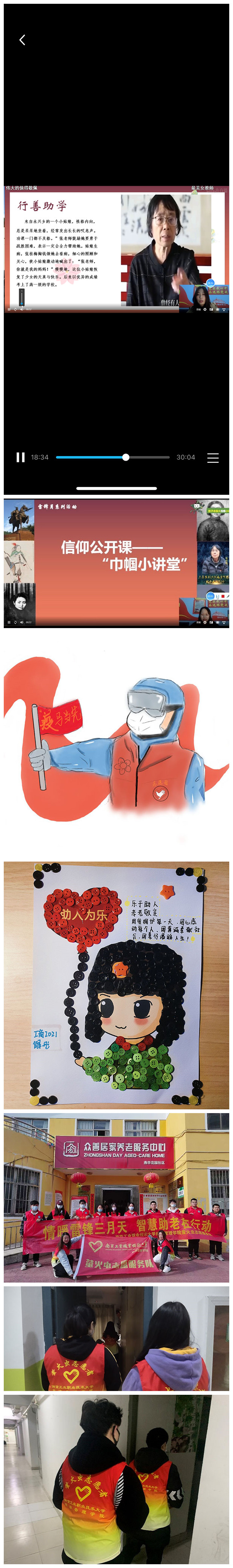 雷锋月期间,万象城官网举办各类志愿服务活动,通过一系列学雷锋活动的开展,进一步弘扬了新时代志愿服务精神,在全校上下大力营造向上向善的志愿文化美德,广大团员青年通过爱心传递、公益服务等形式向建党100周年献礼,让雷锋精神的雨露洒满在南工校园内外。