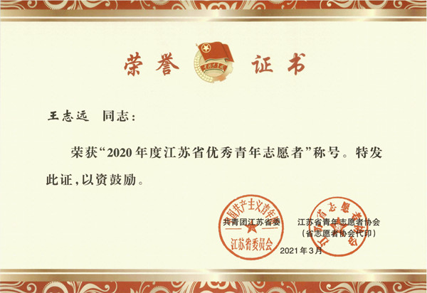 校团委荣获“2020年度江苏省青年志愿服务事业贡献奖”,艺术设计学院团总支荣获“2020年度江苏省青年志愿服务行动组织奖”,航空工程学院电信2036班王志远同学获评“2020年度江苏省优秀青年志愿者”。