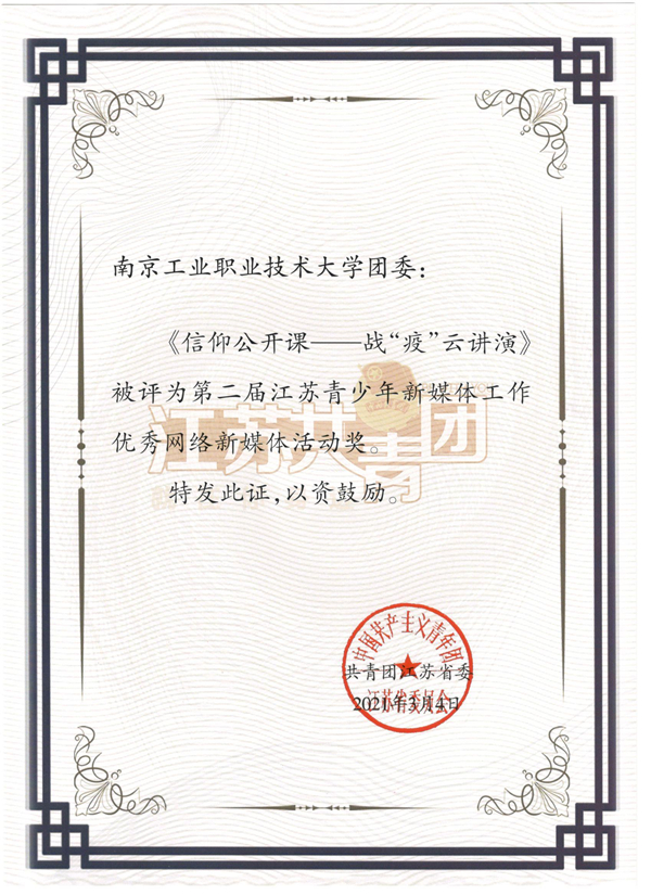 近日,由中共江苏省委网信办指导,共青团江苏省委、江苏青少年新媒体联盟主办的第二届江苏青少年新媒体工作优秀项目奖评选结果正式揭晓。经过专家组评审、现场答辩和网络公示等环节,万象城官网团委荣获“新媒体建设先进单位”;“信仰公开课——战‘疫’云讲演”项目荣获“优秀网络新媒体活动奖”。