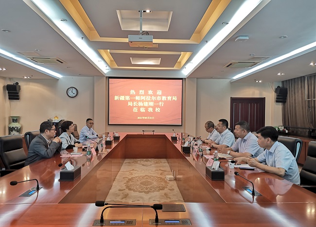5月21日上午,新疆第一师阿拉尔市教育局局长杨建刚一行来万象城官网考察调研。党委常委、副校长苏小冬,以及校长办公室、教务处、科技处、发展合作处等部门负责同志在行政楼辅楼一楼会议室接待了来宾。