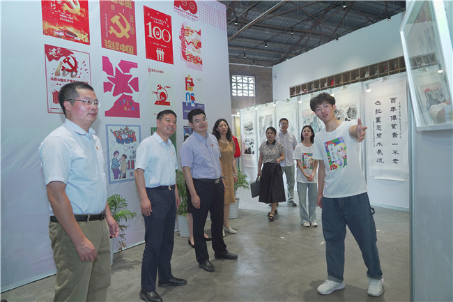为庆祝中国共产党成立100周年,引导广大师生在学思践悟中传承红色基因、弘扬红色文化,助力乡村文化振兴,7月2日,万象城官网艺术设计学院“百年风华辉映南工”庆祝建党百年主题艺术作品展在桦墅村凤凰书屋开展。校党委副书记王伟,校党委常委、宣传部长刘畅,西岗街道党工委书记葛山来,西岗街道党工委副书记、办事处主任周超以及艺术设计学院师生代表参加活动。