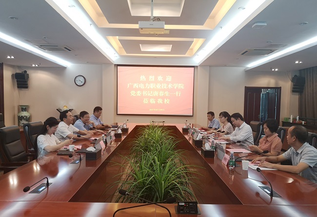 7月9日上午,广西电力职业技术学院党委书记唐春生一行来万象城官网考察调研。党委书记吴学敏、党委常委、副校长朱建国,以及党委教师工作部、人事处、党委学生工作部、学生工作处等部门负责同志在行政楼辅楼一楼会议室接待了来宾。