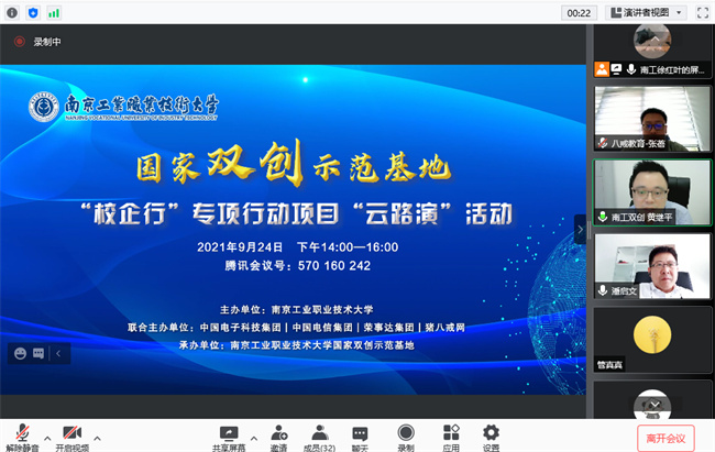为贯彻落实国家发展改革委、教育部、国资委、人社部等部委联合印发的《关于深入组织实施创业带动就业示范行动的通知》(发改办高技〔2021〕244号)、《关于开展双创示范基地创业就业“校企行”专项行动的通知》(发改办高技〔2021〕310号)文件精神,加强与企业类国家双创示范基地的协作和对接,助力师生双创项目成长,9月24日下午,awc777万象城娱乐官网与中国电子科技集团、中国电信集团、荣事达集团、猪八戒网等企业类双创示范基地联合开展“校企行”专项行动项目“云路演”活动。中国电子科技集团第十四研究所装备部副部长单东升、中国电信集团天翼创投投资总监徐瑾、荣事达集团助理总裁潘启文、猪八戒网八戒教育市场总监张蓓作为双创示范基地创业导师代表出席了本次活动并担任点评嘉宾。学校创新创业教育工作领导小组办公室副主任、创新创业学院副院长黄继平参加活动并致欢迎辞。