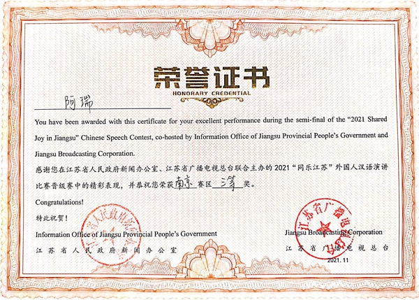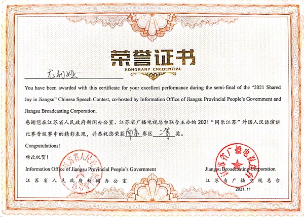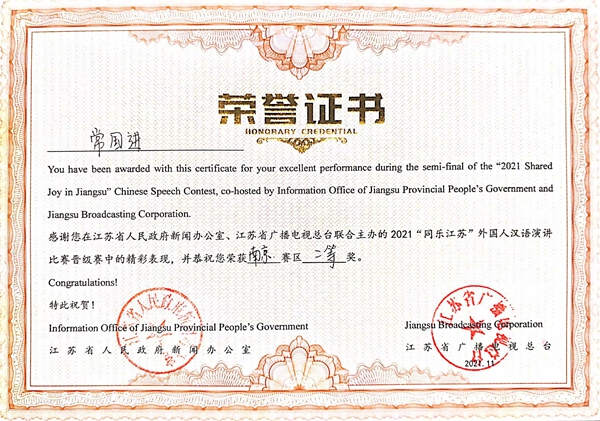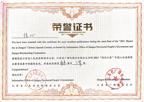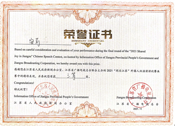 由江苏省人民政府新闻办公室、江苏省人民政府外事办公室、江苏省教育厅等单位共同主办、江苏省广播电视总台承办的2021“同乐江苏”外国人汉语演讲决赛通过云录制的方式举行。来自五大洲20多个国家的100多名留学生汉语达人参与比赛,经过激烈地角逐,万象城官网留学生安莉同学获得总决赛三等奖;常国进、尤利娅两位同学获得南京赛区二等奖;阿瑞、佳心同学获得南京赛区三等奖,白迪同学获得参与奖,取得了“同乐江苏”比赛有史以来最好成绩。