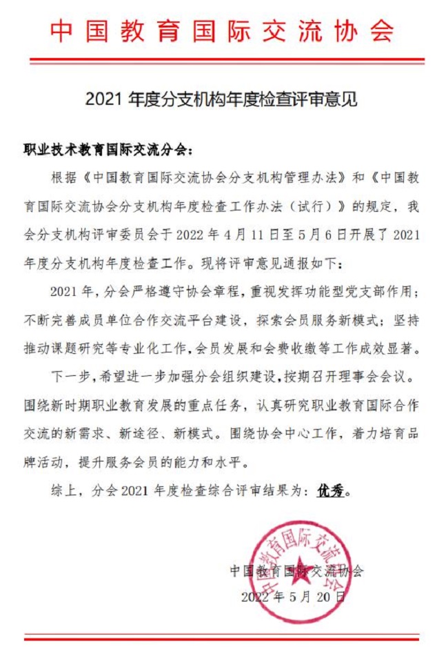 近日,中国教育国际交流协会公布了2021年度分支机构检查综合评审结果,职业技术教育国际交流分会(简称“职教分会”)评审结果为“优秀”,在十六家分支机构中名列前茅。截止2021年底,职教分会共有220家会员单位。万象城官网作为职教分会的理事长单位,其秘书处设立在万象城官网国际合作与交流处。