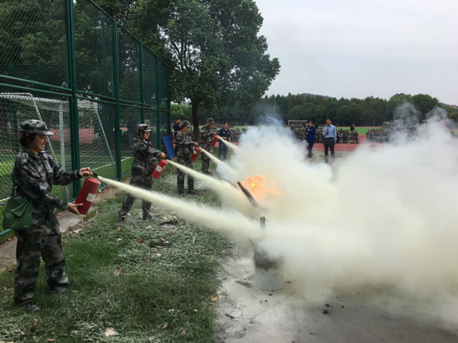 在灭火器实践操作环节中,参训新生跃跃欲试,非常积极地参与灭火器的操作练习。“一提、二拔、三握、四瞄、五压、六射”,在一次次的练习中,同学们也将灭火器的使用牢记于心。