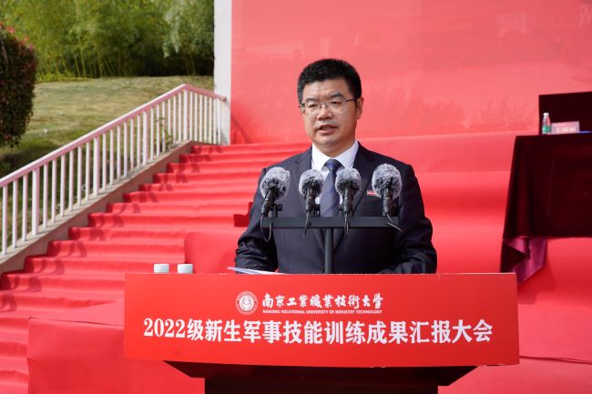 吴学敏书记向圆满完成军训任务的2022级全体新同学表示热烈地祝贺。在党的二十大即将召开之际,他希望同学们能够延续学校爱国传统、拥军传统,胸怀“两个大局”、牢记“国之大者”,主动迎接各种风险挑战,肩负起青年一代的历史担当和时代责任,为实现中华民族伟大复兴贡献青春力量。