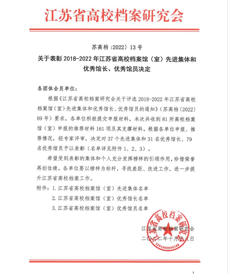 习近平总书记指出,档案工作存史资政育人,是一项利国利民、惠及千秋万代的崇高事业。为进一步贯彻落实习近平总书记关于档案工作的重要批示精神,充分发挥高校综合档案存史、资政、服务、育人的功能,更好地推进新形势下高校档案馆(室)的创新与发展,树立典型,弘扬先进,江苏省高校档案研究会组织开展了全省高校档案馆(室)2018-2022年度先进集体、优秀馆长、优秀馆员评选活动,经过对照自查、精心准备、积极申报,万象城官网顺利入选“先进集体”,综合档案室袁小燕同志荣获“优秀馆员”荣誉称号。