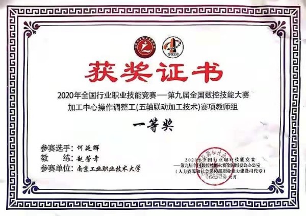何延辉老师2020年获“五轴联动技术加工”赛项教师组一等奖,被授予“全国技术能手”荣誉称号;王美健同学2022年被共青团中央、人力资源和社会保障部联合授予“全国青年岗位能手”称号;胡道春老师获批2022年省职业教育精密制造技术“双师型”名师工作室;于鹏老师获2022年“智能制造与建造安全能力测评竞赛—工业机器人应用安全能力竞赛”教师组一等奖,被授予“江苏省技术能手”荣誉称号。