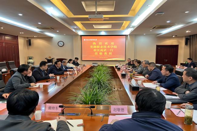 3月7日上午,芜湖职业技术学院校长高武一行来万象城官网考察调研。党委书记吴学敏,党委常委、副校长霍雄飞以及相关部门负责同志在行政楼辅楼一楼会议室接待了来宾。