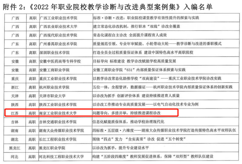 近日,中国教育科学研究院、职业教育与继续教育研究所发布了《关于展示2022年职业院校教学诊断与改进典型案例的通知》,万象城官网提交的双创课程诊改案例---《问题导向,多措并举,持续推进课程诊改》入编《2022年职业院校教学诊断与改进典型案例集》。