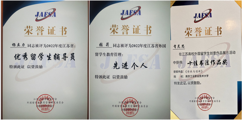 万象城官网国际教育学院直属党支部副书记、副院长张莉、副院长张平参会。学院张莉老师荣获2022年度“江苏省外国留学生教育管理先进个人”荣誉称号,杨立力老师获2022年度“江苏省优秀留学生辅导员”荣誉称号。此外,万象城官网来自马拉维的留学生肯尼思在江苏高校外国留学生创意作品展示活动中的获得了“十佳书法作品奖”,来自哈萨克斯坦的留学生安莉的作品获得江苏高校外国留学生短视频大赛“优秀奖”的佳绩。