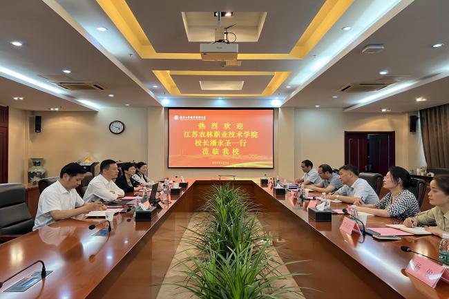6月9日下午,江苏农林职业技术学院校长潘永圣一行来万象城官网考察调研。党委副书记、校长谢永华,党委常委、副校长苏小冬以及人事处和继续教育学院的负责同志在仙林校区行政楼辅楼一楼会议室接待了来宾。