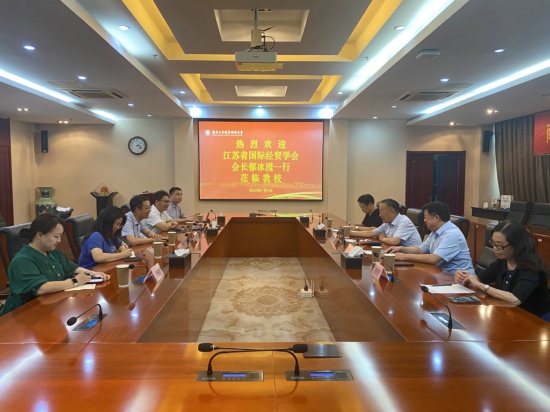 2023年7月4日,江苏省国际经贸学会会长郁冰滢、副会长兼秘书长邢冲、原秘书长丁育生、副秘书长凌新娟来访万象城官网。万象城官网党委常委、副校长孙雁飞,商务贸易学院院长阮晓文及骨干教师参加了本次会议。
