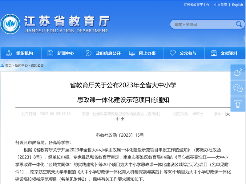 近日,江苏省教育厅发布《关于公布2023年全省大中小学思政课一体化建设示范项目的通知》,由马克思主义学院组织申报的《职业教育思政课一体化共同体建设》项目获得全省大中小学思政课一体化建设高校领衔示范项目立项。