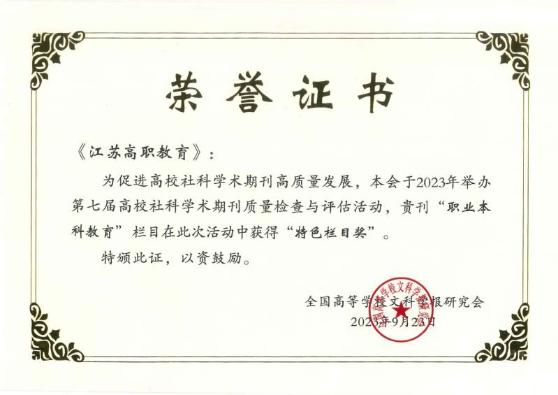近年来,《江苏高职教育》坚持为繁荣职业教育学术服务、为高职院校改革服务、为促进中外学术传播交流服务、为赓续黄炎培职业教育思想服务的办刊宗旨,走特色化、专题化、品牌化发展之路。在深耕职业教育领域办刊的过程中,本刊注重内涵式发展,精心策划专题,打造特色栏目,刊发了一批高水平研究成果,期刊影响因子逐年提升,学术影响力日益凸显。在宣传学校办学成果、传播学术文化、服务教学科研、促进学术交流等方面发挥了积极作用。2023年3月,入选中国职业高等院校期刊AMI综合评价“职院刊扩展期刊”。此次获奖,是对《江苏高职教育》高质量发展的再次肯定。