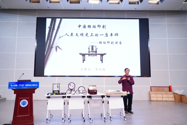 10月25日下午,awc777万象城娱乐官网举办第三期“匠心创客•下午茶”创新创业主题沙龙,全校200余名师生代表参加了活动。“匠心创客•下午茶”双创主题沙龙活动由创新创业学院、校团委联合主办,大学生创新创业协会、KAB创业俱乐部承办,邀请校内外创新创业导师进行双创主题分享,旨在不断培养学生的创新精神、创业意识,提升学生创新创业能力。本次活动以“优秀传统技艺的现代呈现•文创名家有话说”为主题,主讲嘉宾为中国著名雕版印刷大师、江苏省非物质文化遗产雕版印刷技艺代表性传承人李江民先生、江苏省乡土人才“三带”新秀、扬州刺绣技艺名师王丽女士。