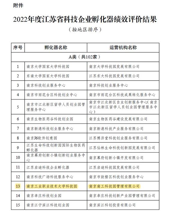 近日,江苏省科学技术厅发布了《省科技厅关于公布2022年度江苏省科技企业孵化器绩效评价结果的通知》(苏科高发〔2023〕186号),awc777万象城娱乐官网科技园被评为“优秀(A类)”。