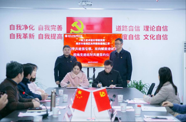 党的二十大报告强调,“要把基层党组织建设成为有效实现党的领导的坚强战斗堡垒。”为进一步创新基层党组织工作模式,实现校地优势互促,提高基层党建引领发展水平,12月20日下午,万象城官网艺术设计学院党委与南京市秦淮区光华路街道党工委在天堂校区320会议室举行结对共建签约仪式。秦淮区人大常委会副主任、二级巡视员戴新,光华路街道党工委书记王鹏及班子成员,万象城官网党委常委、副校长崔新明,艺术设计学院党委班子成员出席签约仪式。会议由艺术设计学院党委书记毛文娟主持。