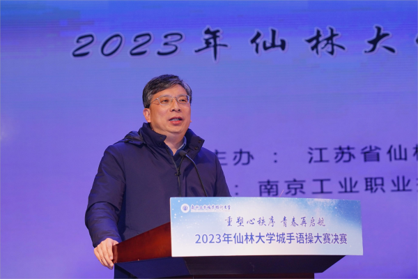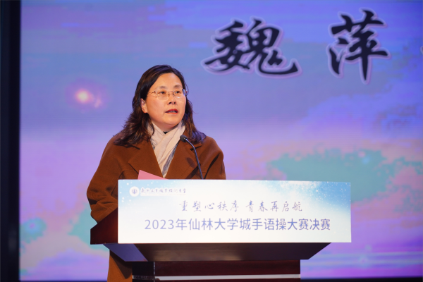 魏萍在致辞中对主办方江苏省仙林大学城心理健康教育研究中心的大力支持以及仙林大学城各兄弟院校的鼎力配合和积极参与表示感谢,对全体参赛队员的刻苦训练和辛勤付出表示肯定。她指出,手语操是一种传递爱、传递温暖、传递友谊的心理健康教育活动,在手语操表演中体现出的积极向上、团结友爱的精神品质将是同学们走向社会、实现人生价值的重要基础。本次比赛为各校心理工作搭建了学习交流的平台,期待同学们能够在此次手语操比赛中发挥最好水平,在比赛中相互学习、相互鼓励、共同提高,让更多的人了解和欣赏手语操的独有魅力,营造积极、温暖、和谐、互助的校园氛围。