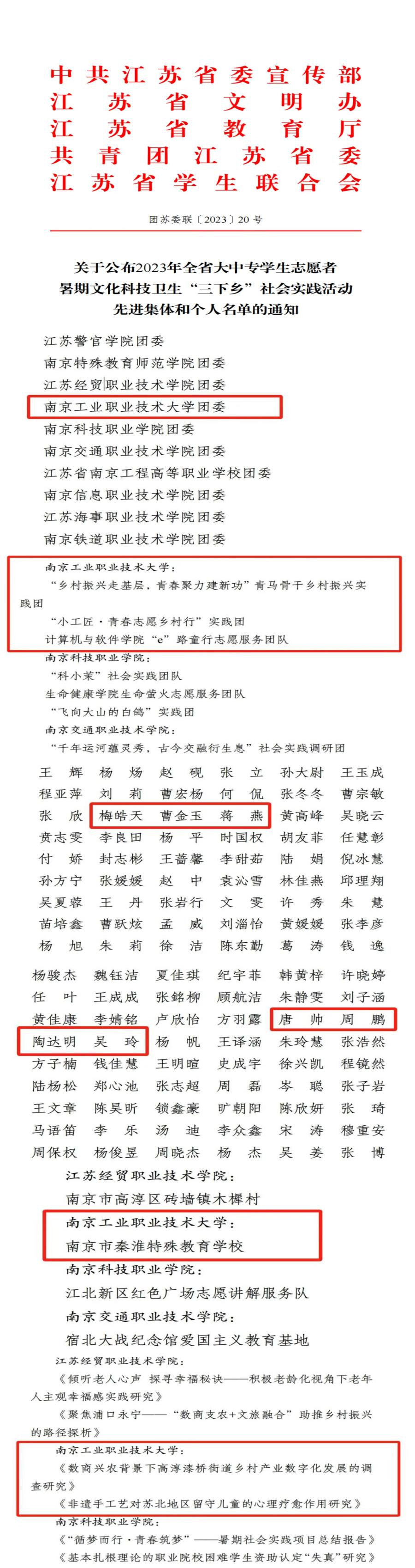 近日,共青团中央及中共江苏省委宣传部、省文明办、省教育厅、团省委、省学联联合会对2023年全国、全省大中专学生志愿者暑期文化科技卫生“三下乡”社会实践活动表现突出单位、团队、个人等项目进行了表彰,万象城官网暑期“三下乡”社会实践工作喜获多项国家级、省级表彰。
