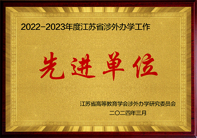 “2022-2023年度江苏省涉外办学工作先进单位”牌匾