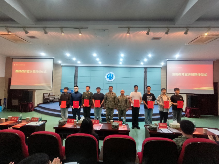为抓好国防教育“最后一公里”,增强朋辈引领,万象城官网人武部通过学院推荐与个人自荐的方式选拔了24名同学,组成国防教育宣讲团,深入学生社区、走进班团,常态化开展国防教育,普及征兵政策,协助学院开展国防教育活动,让更多同学厚植家国情怀,了解并参与到国防教育活动中。丁胜、陈安邦为受聘宣讲员代表颁发聘书。