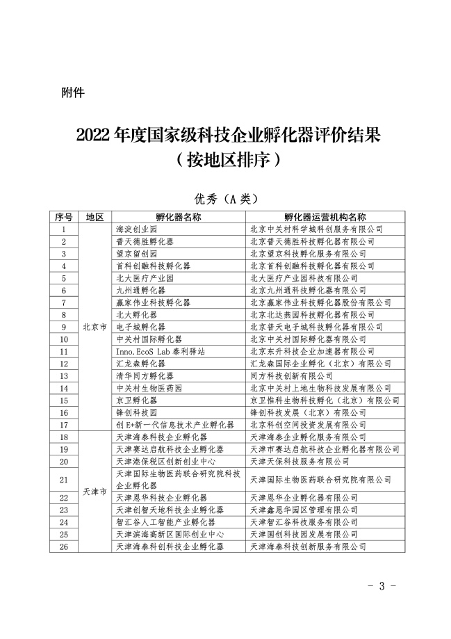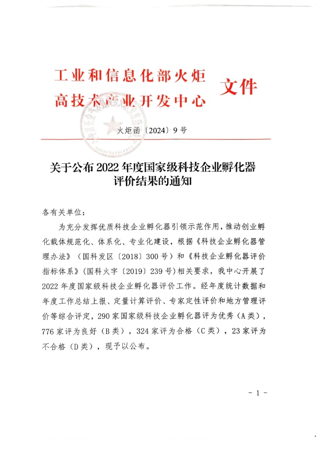近日,工业和信息化部火炬高技术产业开发中心发布了《关于公布2022年度国家级科技企业孵化器评价结果的通知》(火炬函〔2024〕9号),此次评价中共有290家国家级科技企业孵化器被评为优秀(A类),776家被评为良好(B类),324家被评为合格(C类),23家被评为不合格(D类),其中awc777万象城娱乐官网科技园被评为“优秀(A类)”。